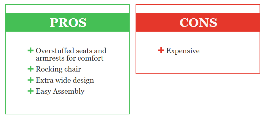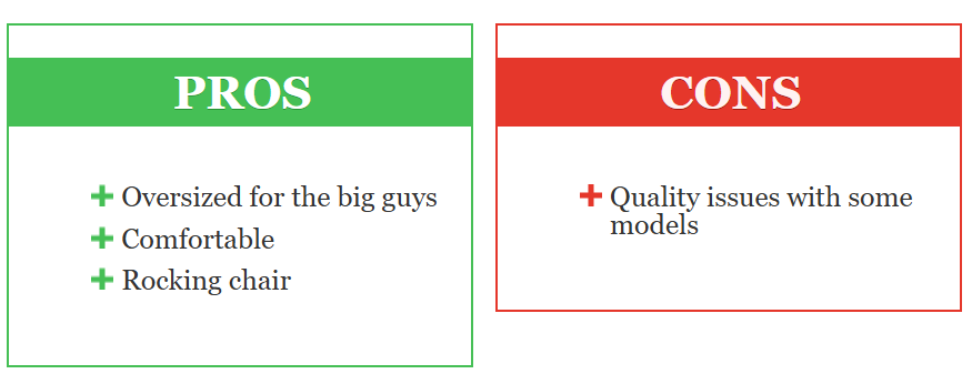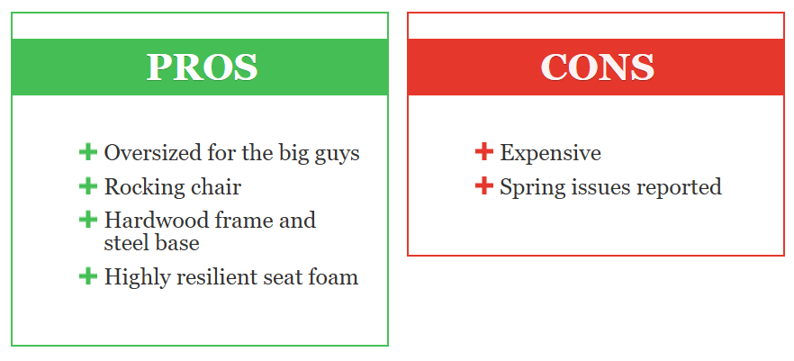 Pros include the fact that it’s over-sized for the big guys, it’s a rocking chair, has a very sturdy hardwood frame and steel base, and a resilient foam within the seat so it doesn’t confirm to your ass.
