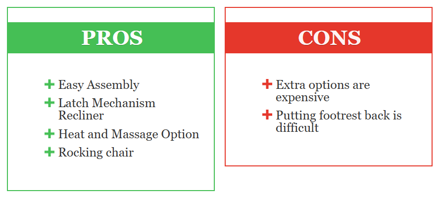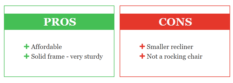 For cons, it is a smaller recliner so it won’t be good for the bigger guys either. In addition, it’s also not a rocking chair.