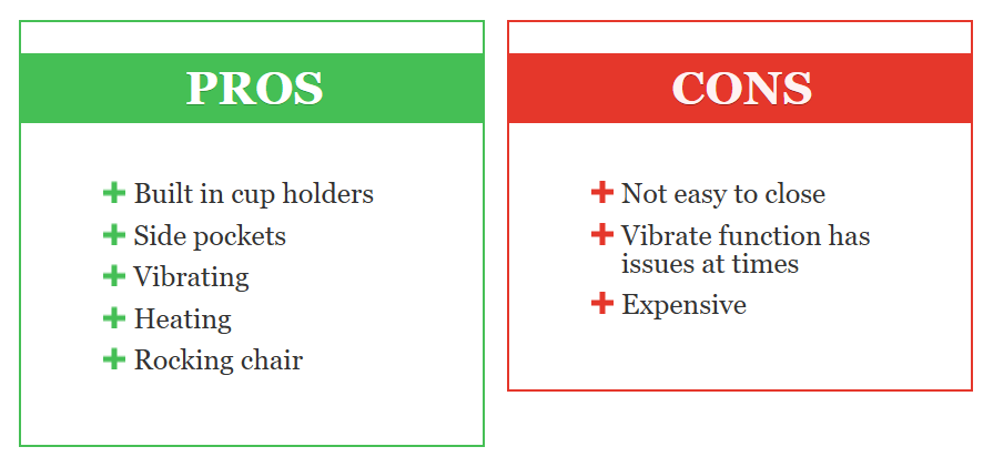 Now let’s focus on the negatives…..like many of the others, sometimes this can be considered hard to close once it’s opened. In researching, we discovered that sometime there are issues with the vibrate function on the recliner, but that doesn’t seem to be a common problem. Lastly, all these extra bells and whistles come at a cost. You’ll have to pay a little more for this one but it’s worth it if you have the cash.