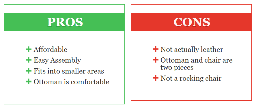 In terms of the cons, there are a few. First, this isn’t actually leather. It’s some type of imposter and that’s not cool. However…..if you’re on a budget this does LOOK like leather at least. Beyond that, this one is two separate pieces and although the back will recline for you, you don’t get the thrill of yanking on the level to recline at your whim. Finally, it isn’t a rocking chair. Maybe not a huge deal to all, but one thing that may suck to some.